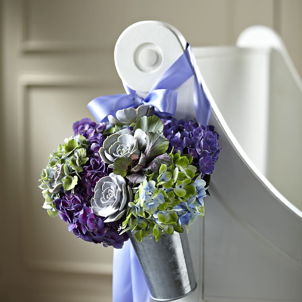 Decorate your church for your wedding ceremony in a charming, on trend style that you and your guests will absolutely adore! Purple hydrangea and antique purple hydrangea are accented with medium succulents and ornamental kale to create a dynamic look. Arranged in a shining silver metallic galvanized French bucket for a rustic, sweet appeal, and meant to hang over the edge of the pew with the help of a lavender satin ribbon, this gorgeous floral arrangement is set to create a picture perfect look for your once in a lifetime day.